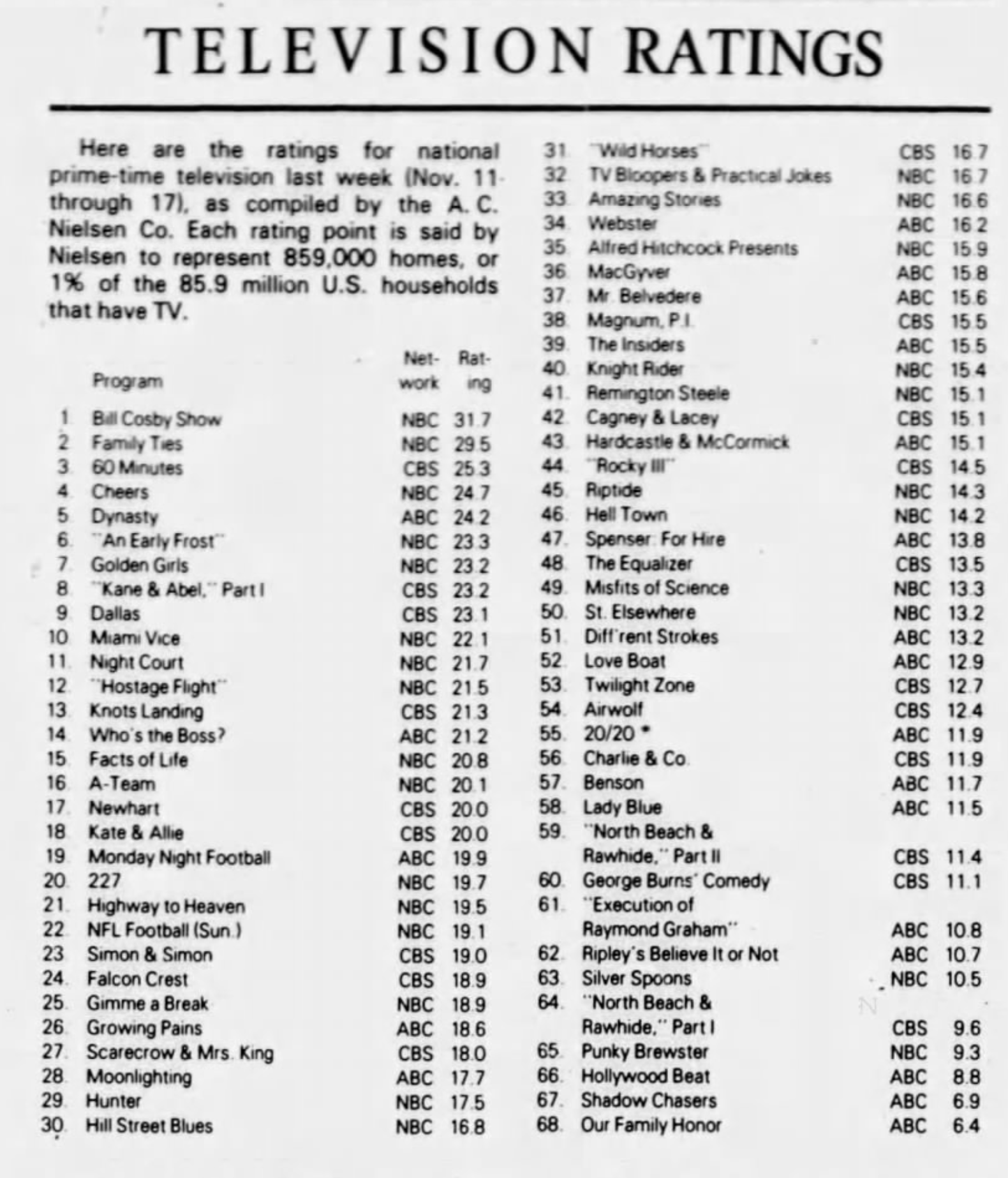These days, pretty much everyone walks around with a TV in their pocket, and there are so many viewing options that pretty much every show — no matter how popular it might be in the current definition of the term — is broadcast for a niche audience. But for decades, the small number of networks and the relative lack of options for rewatching anything meant that Americans watched a lot of the same stuff at the same time — and even programs that have largely been forgotten today drew what would now be considered massive ratings. In this recurring column, we take a fond and often somewhat mystified look back at the Nielsen ratings from long ago.